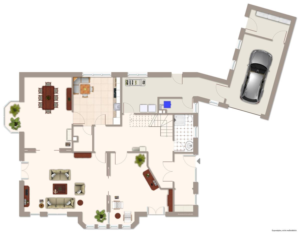 Erdgeschoss: 1 x Wohnzimmer, 1 x Esszimmer, 1 x Bibliothek, 1 x Küche, 1 x Bad mit Dusche und Gäste-WC, 1 x Vorratsraum, 1 x HWR, 1 x Heizungsraum, 1 x Glas-Erker.