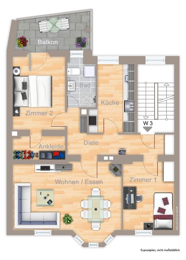 Alle 3-Zimmer-Wohnungen verfügen über eine geräumige Küche mit Blick in den begrünten Hinterhof. Weiterhin gibt es ein geräumiges Schlafzimmer mit separater Ankleide zur Gartenseite des Hauses. Das Badezimmer ist mit einer Badewanne, Duschkabine, Badmöbel mit Einbauwaschbecken, Kosmetik-Spiegelschrank und WC ausgestattet. Aus dem Schlafzimmer haben Sie einen direkten Zugang zum überdachten Balkon. Desweiteren verfügt die Wohnung über einen großen und sonnendurchfluteten Wohn- /Essbereich mit großer Fensterfront.