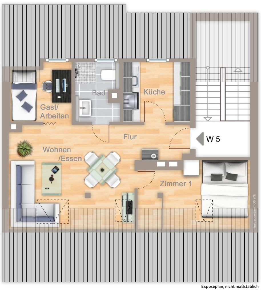 Das 5-Familienhaus verfügt über vier ähnlich geschnittene 3-Zimmer-Wohnungen und eine 2-Zimmer-Wohnung im Dachgeschoss. Der repräsentative Hauseingang mit Stuckdecken bietet ein ansprechendes Flair.