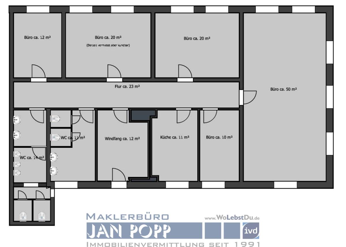 Ein im ursprünglichen Grundriss vorgesehenes Büro mit ca. 50 m² wurde aktuell in zwei separate Räume unterteilt. Diese Teilung kann bei Bedarf jedoch problemlos wieder zurückgebaut werden, sodass eine flexible Anpassung an individuelle Raumkonzepte möglich ist.