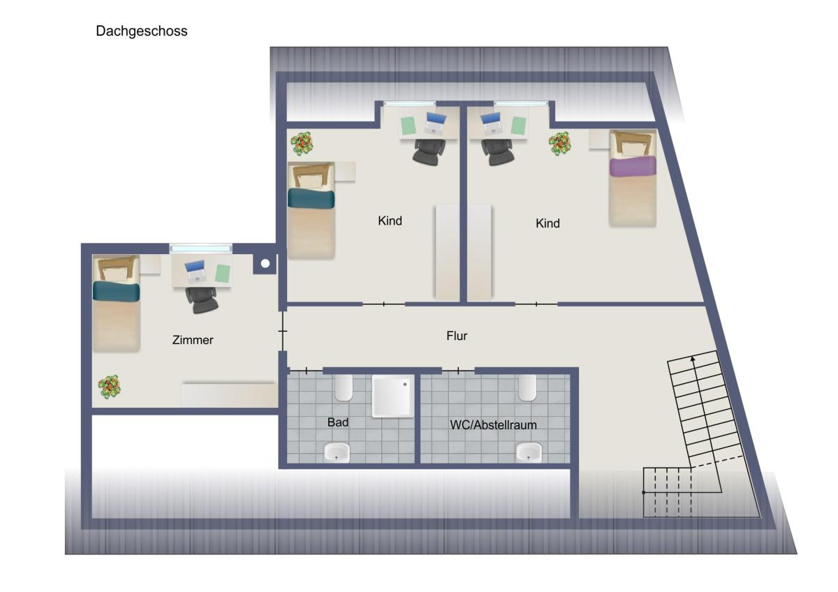Im Dachgeschoss sind auf ca. 61 m² drei weitere Schlafzimmer, ein Duschbad und ein sep. WC mit Speicherraum.