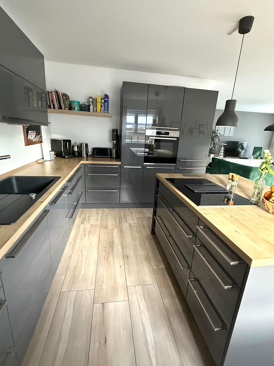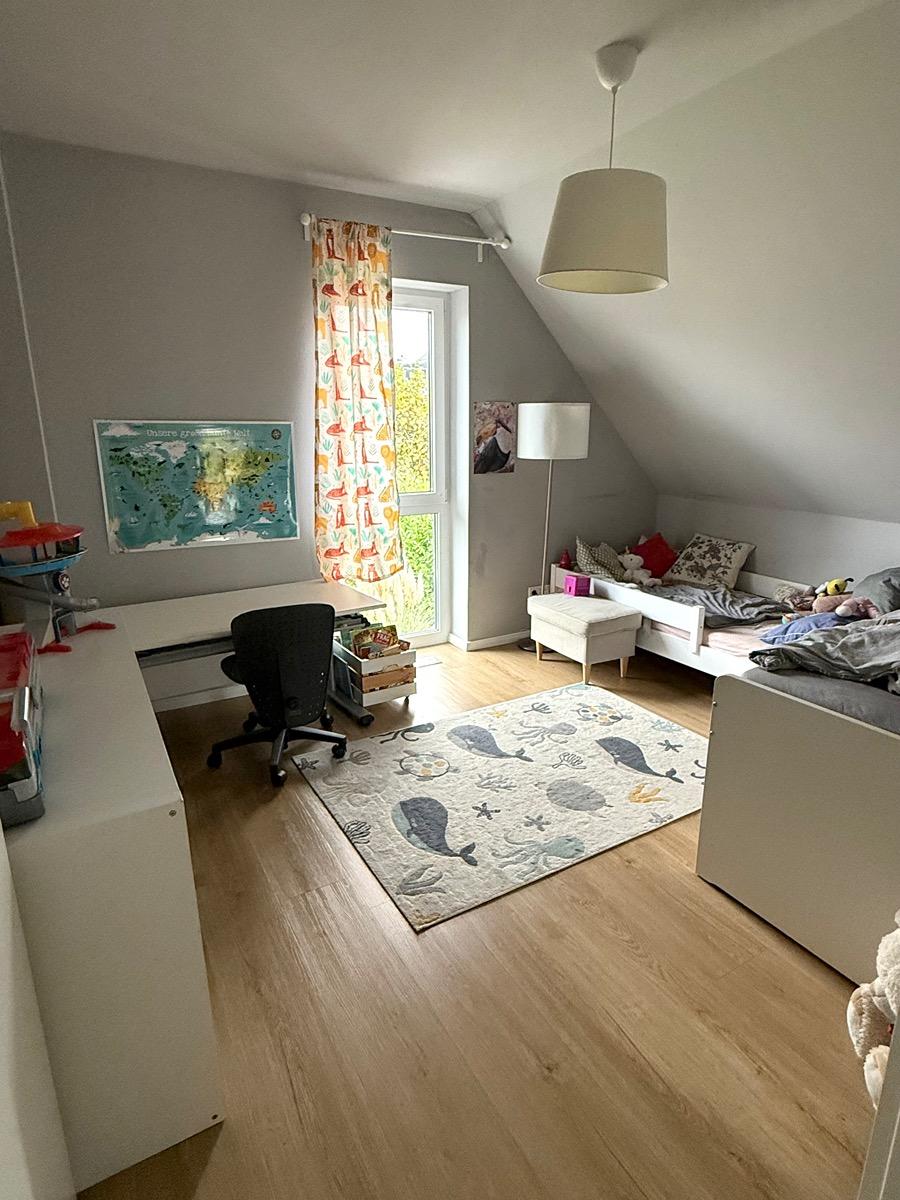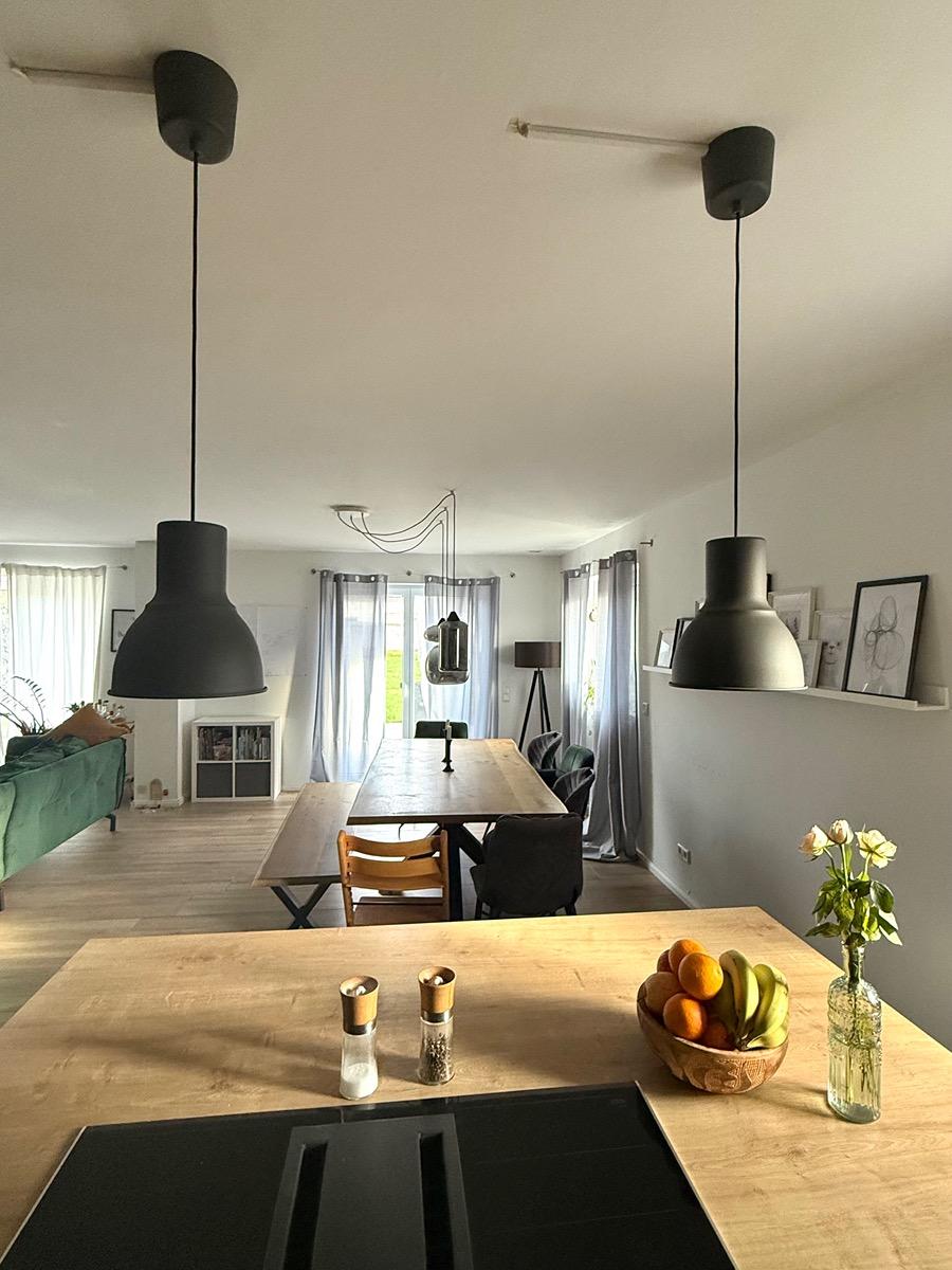 Der großzügige Wohn- und Essbereich mit offener Küche bildet den zentralen Lebensmittelpunkt des Hauses. Große, 3-fach verglaste Fenster sorgen für viel Tageslicht. Die Fußbodenheizung ist in allen Räumen separat steuerbar. Im Erdgeschoss sind elektrische Rollläden installiert, im Obergeschoss manuell bedienbare Rollläden.
