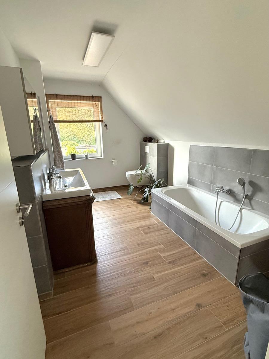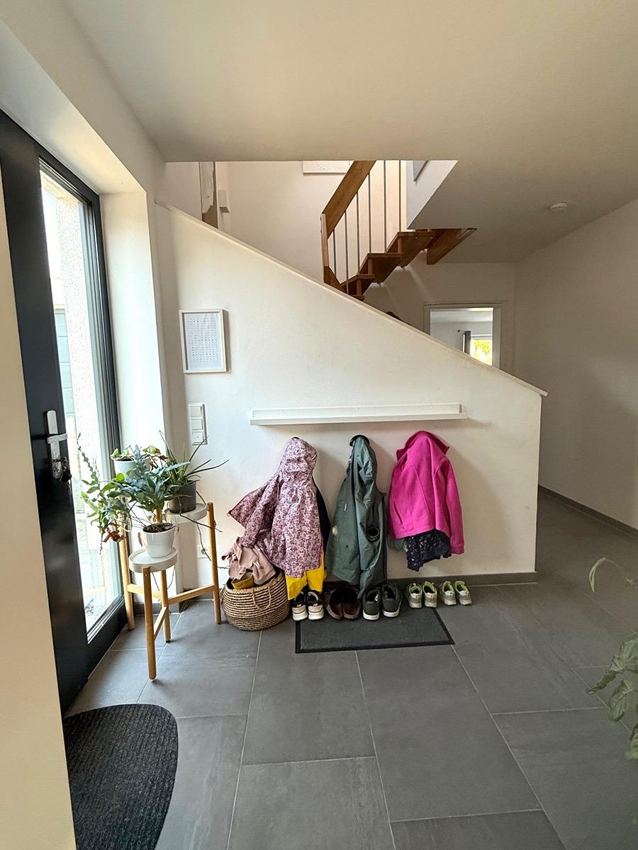 Eine Echtholztreppe verbindet die Etagen. Zusätzlich steht ein vollständig nutzbarer Dachboden über die gesamte Hausfläche mit Fenster zur Verfügung.
