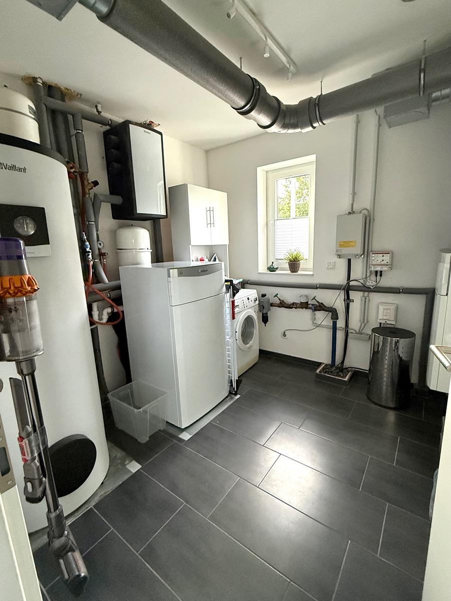 Das massiv gebaute Haus erfüllt den KfW-55-Standard (Effizienzhaus 55 Plus). Beheizt wird es über eine Erdwärmepumpe mit Kollektoren im Garten. Eine kontrollierte Be- und Entlüftungsanlage mit Wärmerückgewinnung sorgt für ein nachhaltiges Energiekonzept mit sehr niedrigen Heizkosten. Massiver Schornstein und Rückstausicherung runden die hochwertige Ausstattung ab.