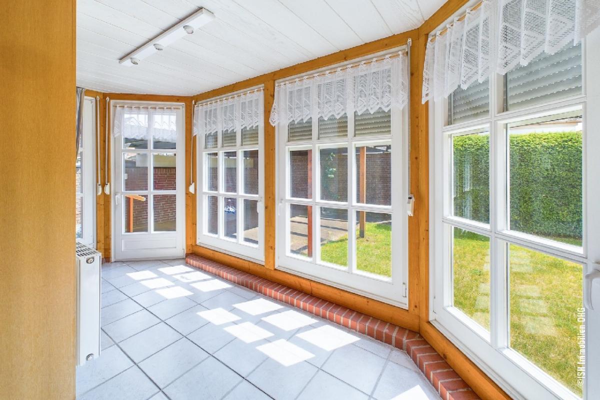 Über einen sehr hellen und praktischen Windfang gelangen Sie in den Flur, der als Dreh- und Angelpunkt des Hauses zu sehen ist und über einen praktischen Einbauschrank verfügt. Geradeaus führt Sie der Weg direkt zum Wohn- und Esszimmer mit großem Fenster und Zugang zur vorderen Terrasse. Hier finden neben dem gemütlichen Sofa auch ein großer Esstisch seinen Platz. Über einen kleinen Erker oder eine Schiebetür gelangen Sie in den Kochbereich. Von hier geht es durch eine weitere Terrassentür zu der zweiten, großen und überdachten Terrasse. Hier können Sie mit guter Sonnenausrichtung den hinteren Garten genießen und sind dank einer gewachsenen Hecke blick- und winddicht geschützt.