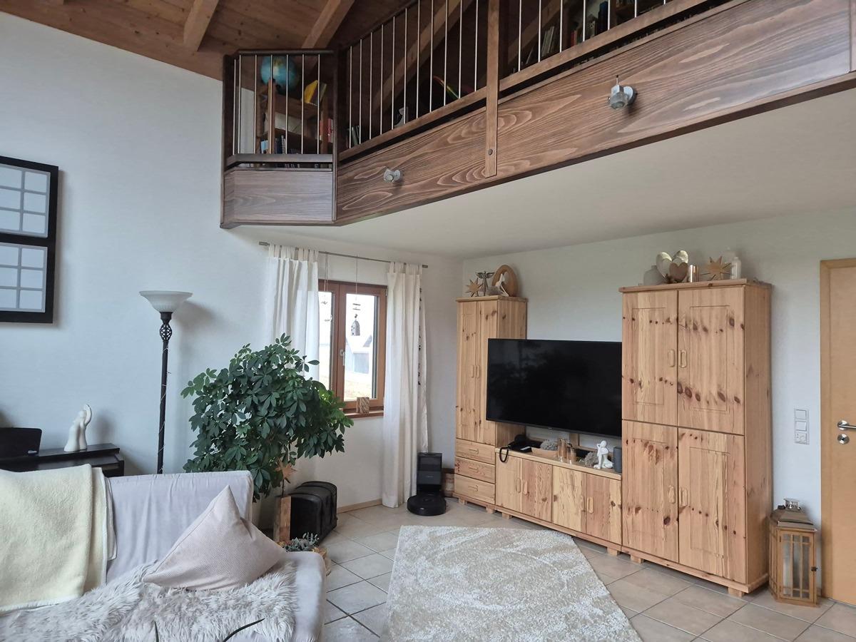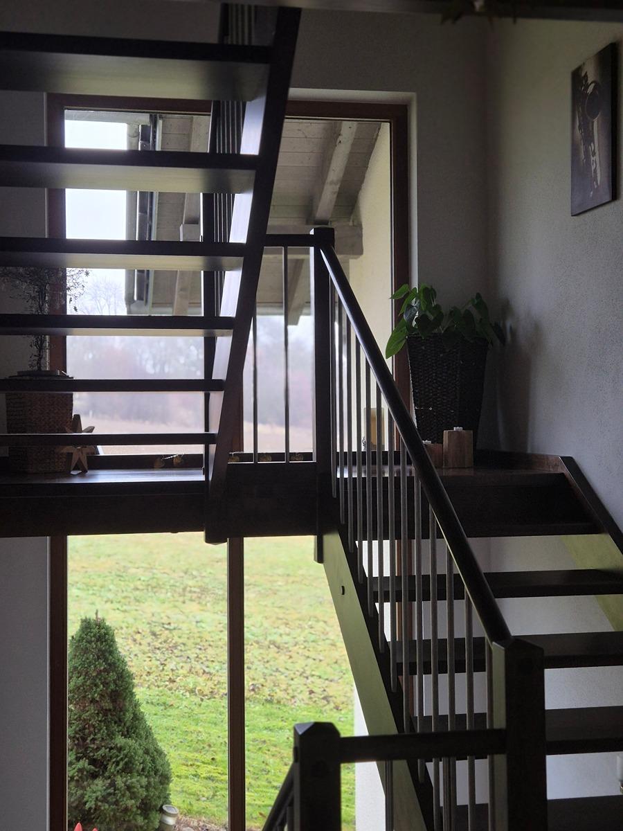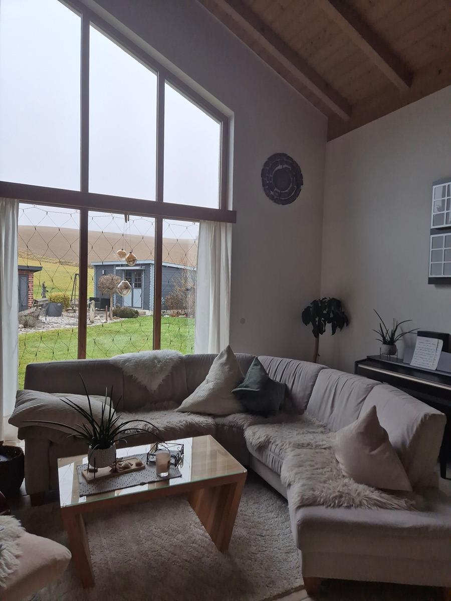 Bereits beim Betreten des Hauses wird der hohe Anspruch sichtbar: Ein offener, einladender Eingangsbereich mit Garderobe führt in die lichtdurchfluteten Wohnräume. Das Wohnzimmer mit beeindruckendem Sichtdachstuhl, Galerie und hochwertigem Holzofen bildet das Herzstück des Hauses und schafft eine besondere Wohnatmosphäre mit viel Raum und Weite.