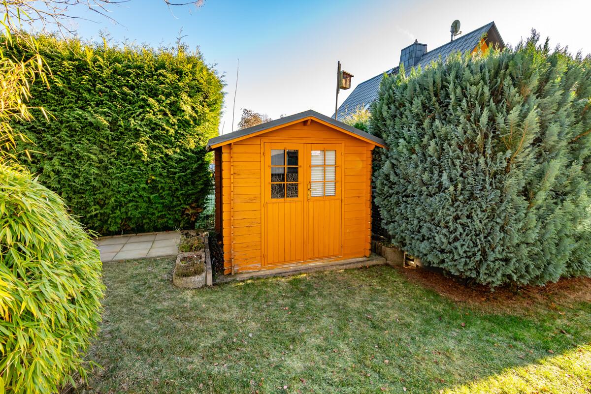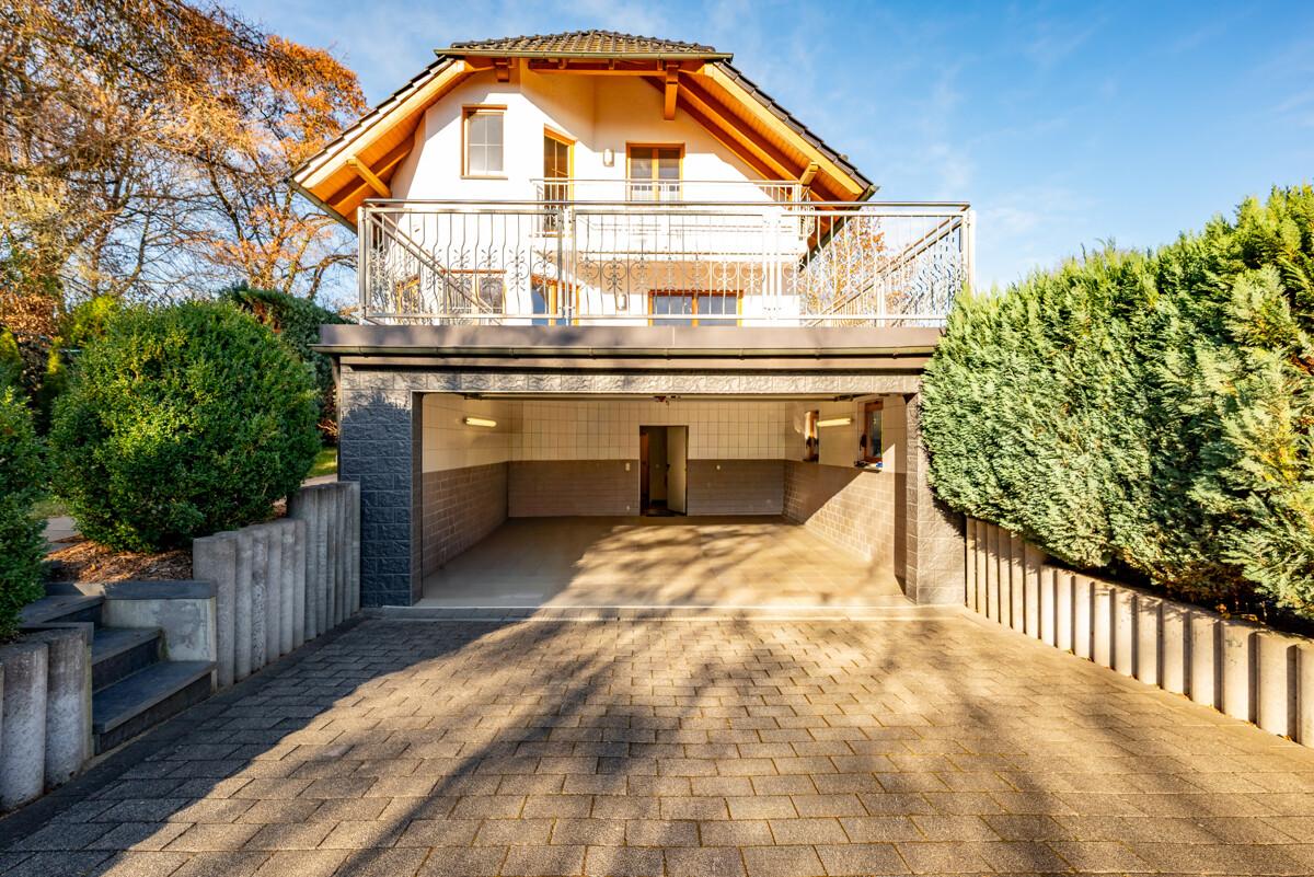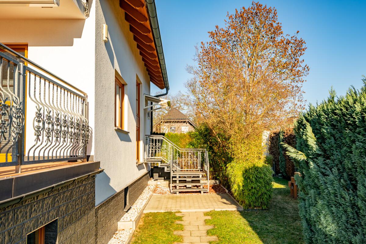 Das großzügige Wohnhaus wurde 2002 in Massivbauweise im hinteren Grundstücksbereich errichtet. Es verfügt über eine moderne und hochwertige Ausstattung, ist voll unterkellert mit Doppelgarage. Zur Sonnenseite gelegen sind Balkon und die Terrasse, die vom Wohnzimmer aus begehbar ist. Der Garten ist eingezäunt, Sichtschutz bieten Thuja-Hecken. Er ist pflegeleicht gestaltet mit Ziersträuchern. Entspannung bieten im Sommer der Familien-Yacuzzi, im Winterhalbjahr die Familiensauna im Keller.