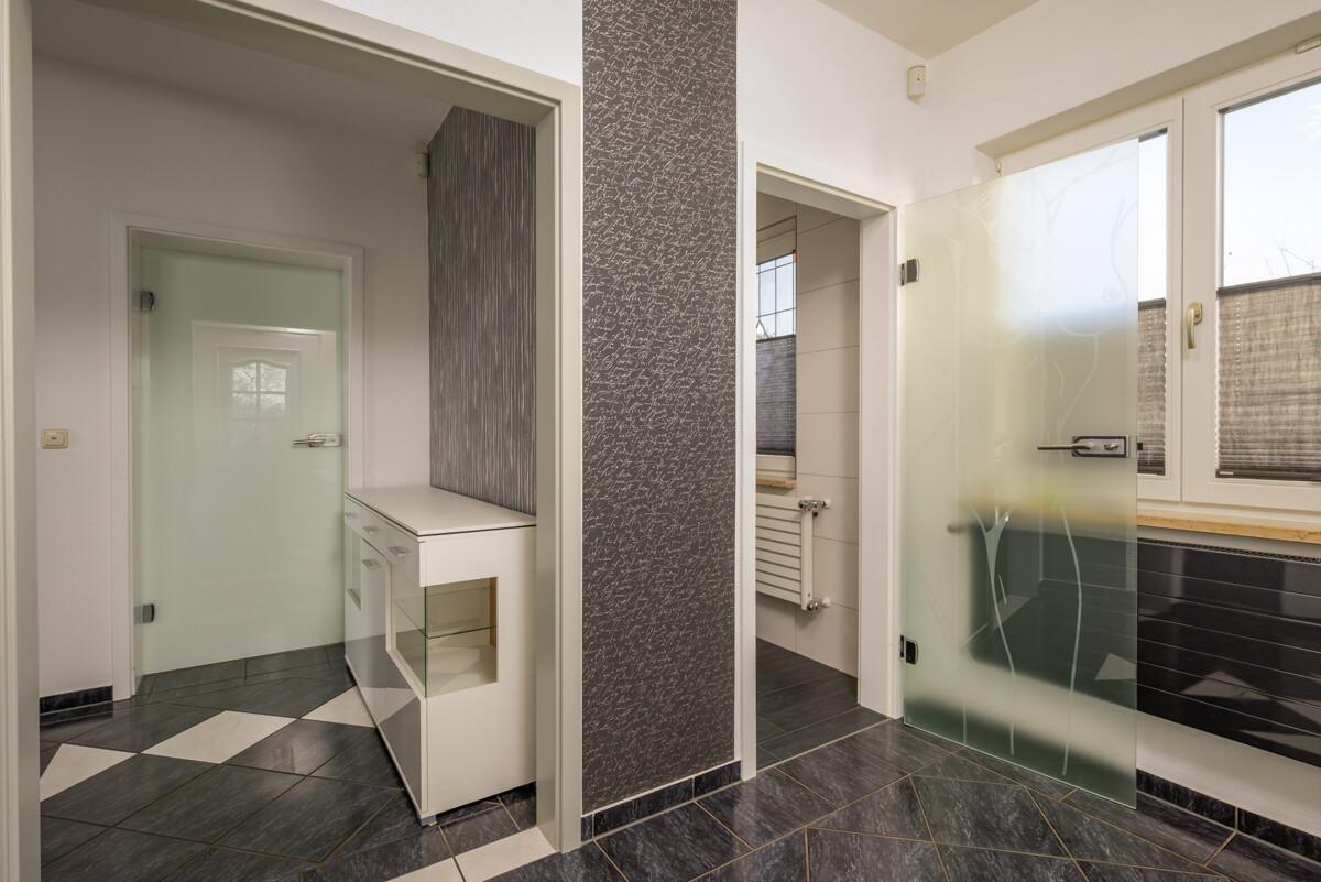 - Familienbad im EG mit Eckwanne und bodengleicher Glas-Dusche
