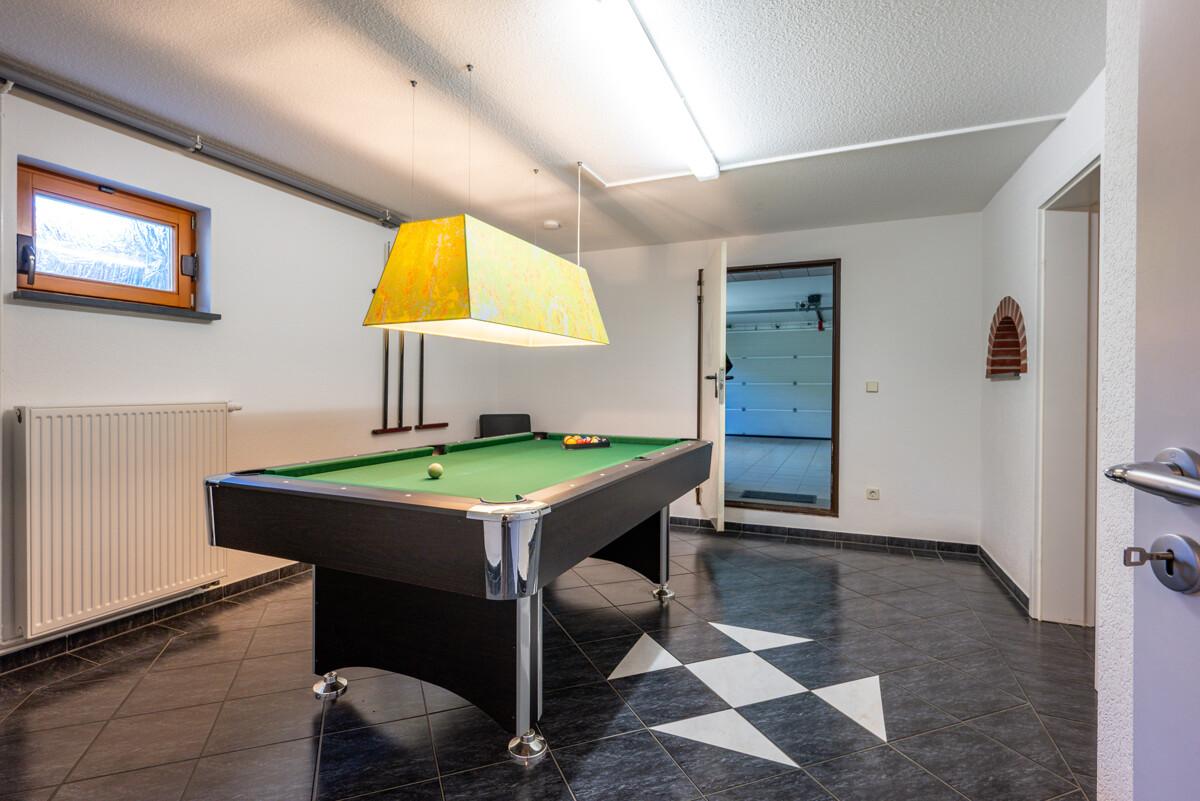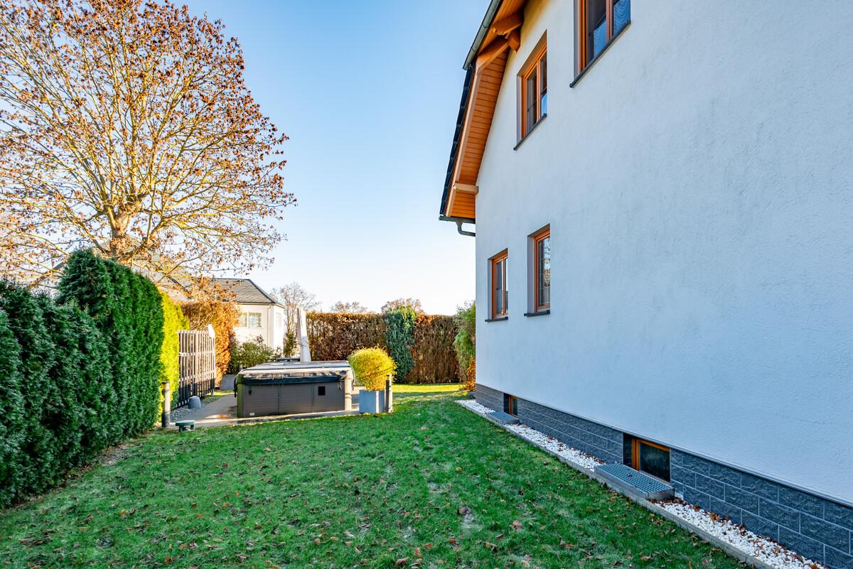 Das großzügige Wohnhaus wurde 2002 in Massivbauweise im hinteren Grundstücksbereich errichtet. Es verfügt über eine moderne und hochwertige Ausstattung, ist voll unterkellert mit Doppelgarage. Zur Sonnenseite gelegen sind Balkon und die Terrasse, die vom Wohnzimmer aus begehbar ist. Der Garten ist eingezäunt, Sichtschutz bieten Thuja-Hecken. Er ist pflegeleicht gestaltet mit Ziersträuchern. Entspannung bieten im Sommer der Familien-Yacuzzi, im Winterhalbjahr die Familiensauna im Keller.