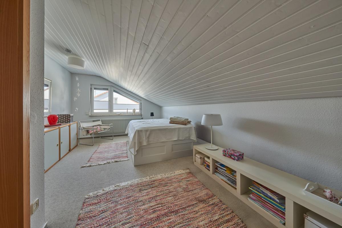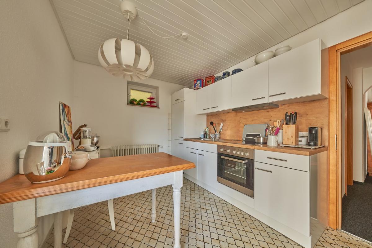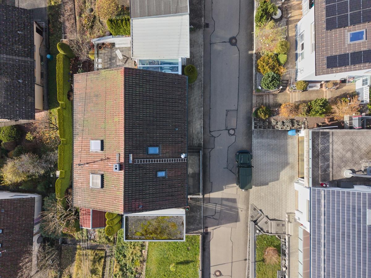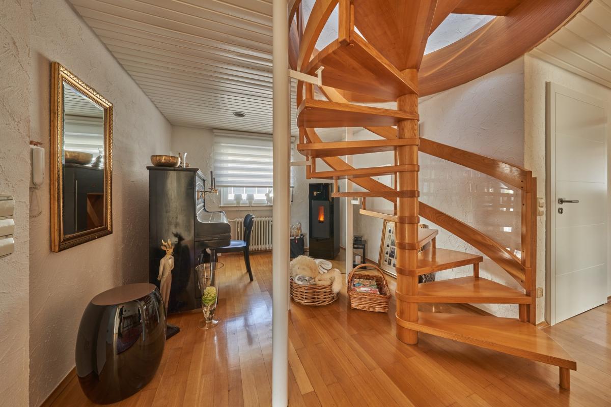 Das Erdgeschoss verfügt über ein lichtdurchflutetes Wohnzimmer mit Zugang zum Balkon, eine separate Küche mit Essbereich, ein Wintergarten, ein Duschbad, welches aktuell auch als Waschküche genutzt wird, ein separates WC sowie ein Schlafzimmer. Das Dachgeschoss wurde ca. 1983 voll ausgebaut und durch eine Wendeltreppe mit dem Erdgeschoss verbunden. Hier befinden sich vier weitere Zimmer und ein voll ausgestattetes Badezimmer mit Badewanne, Dusche, Doppelwaschbecken und WC.