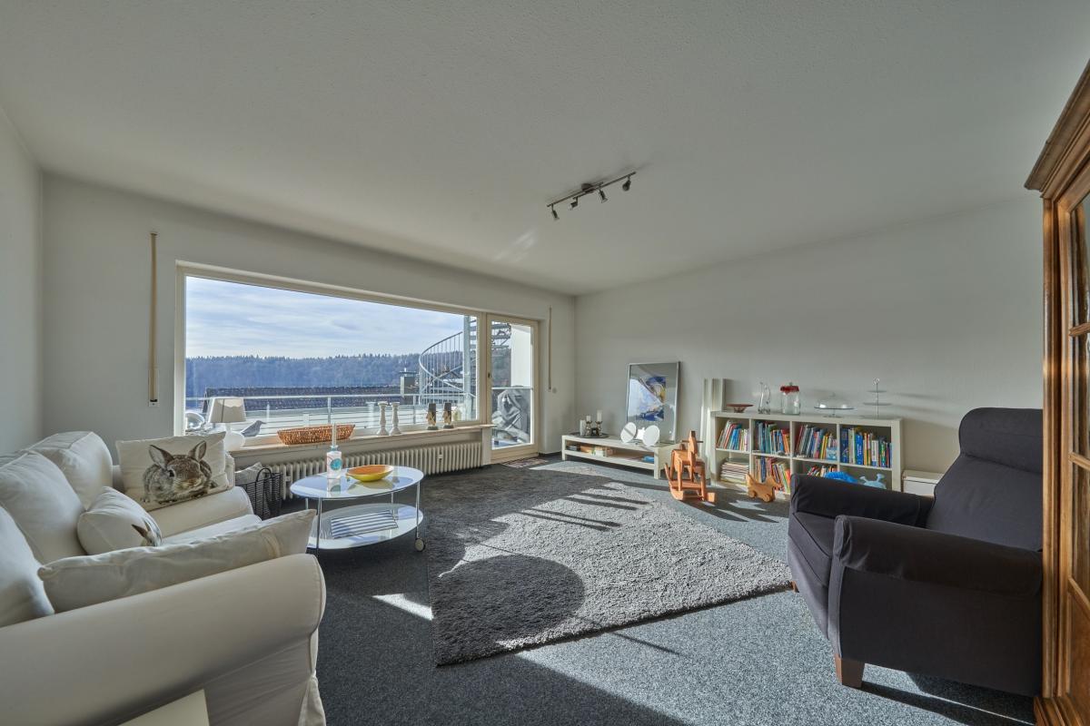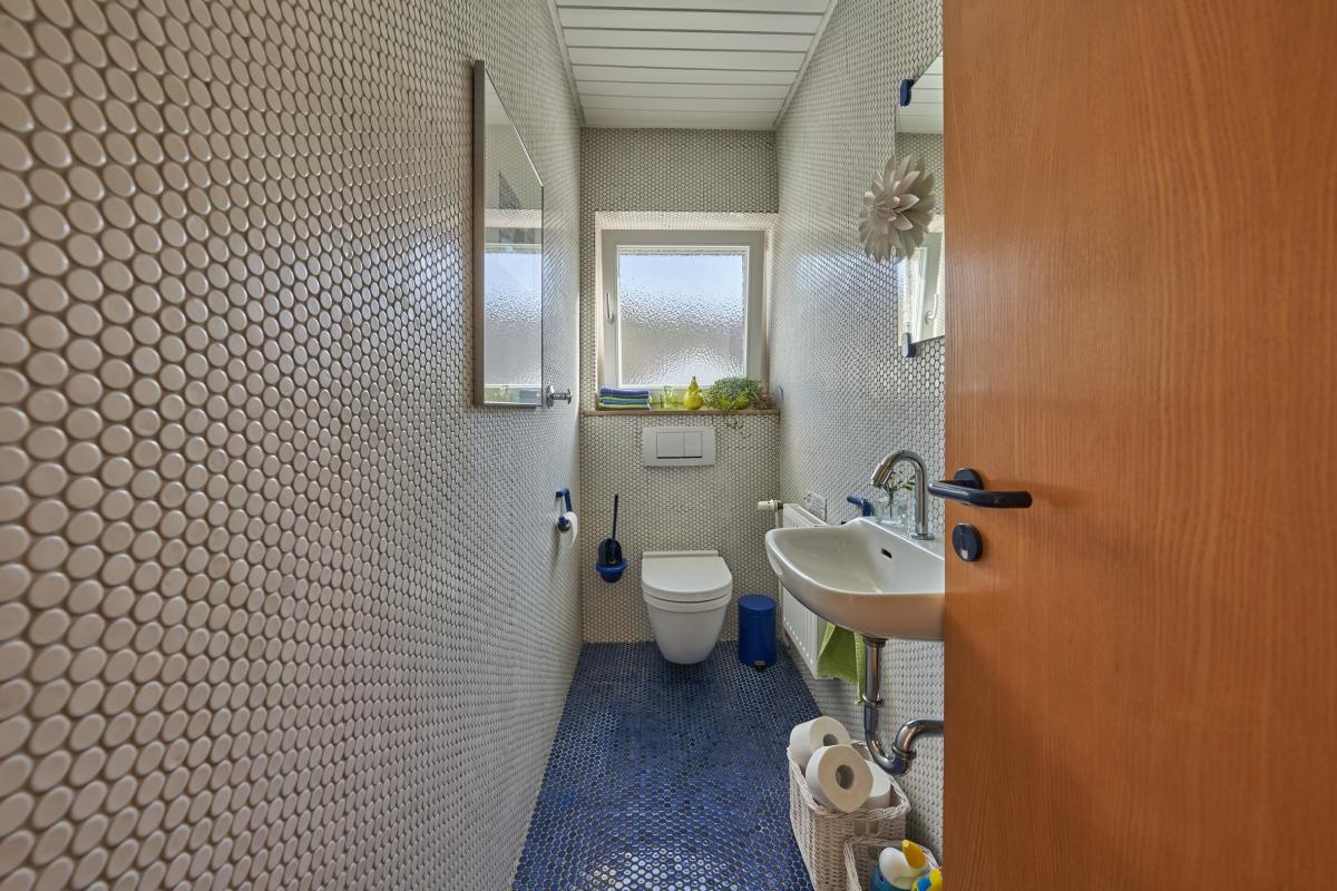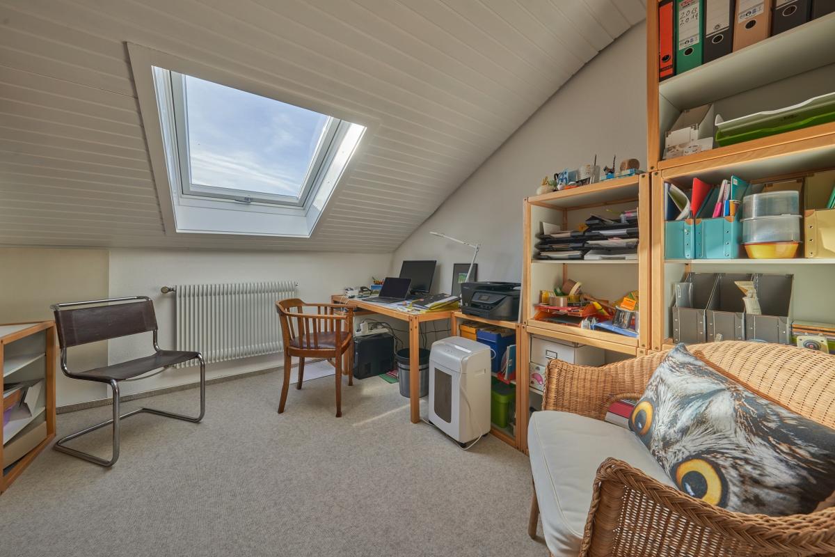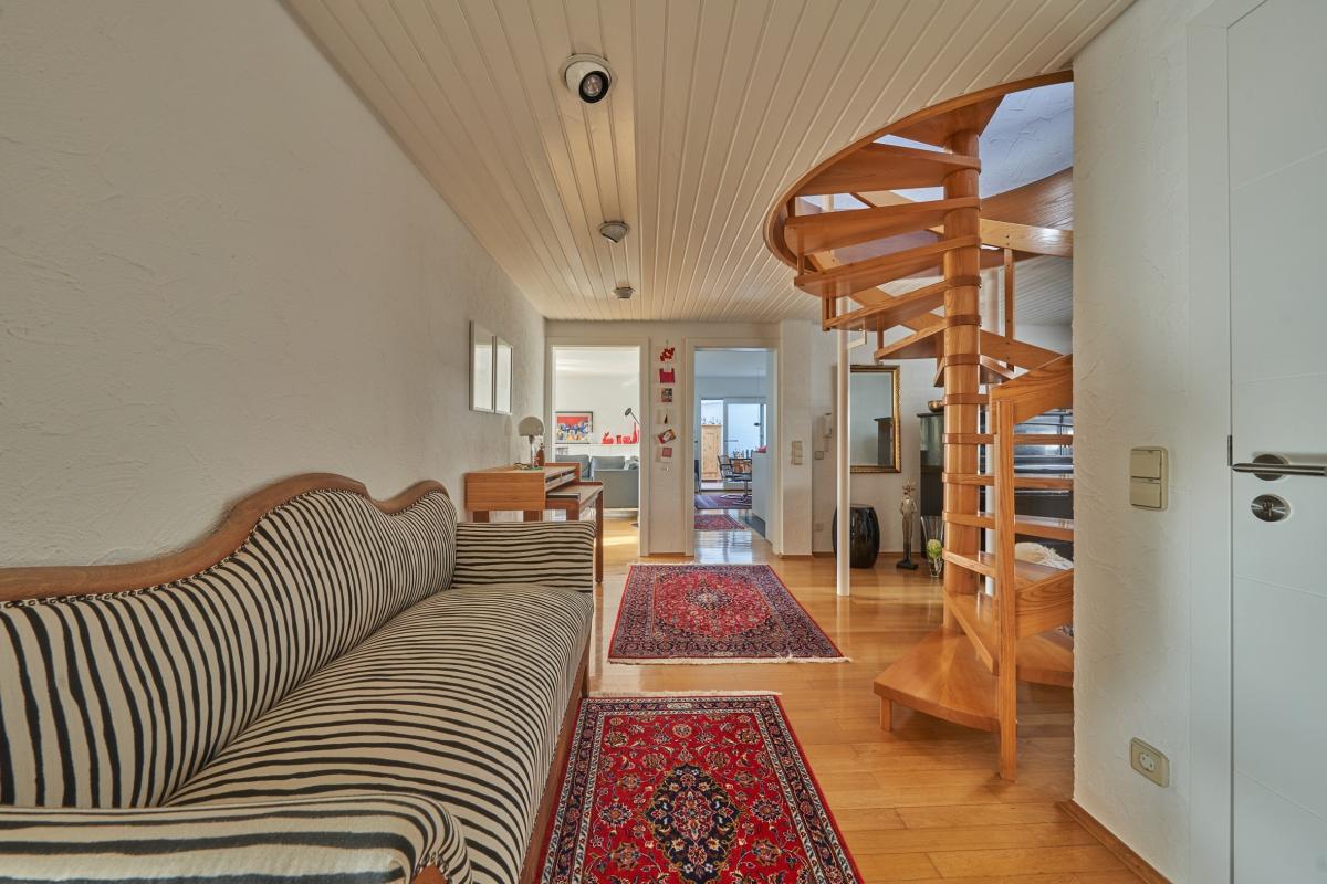 Das Erdgeschoss verfügt über ein lichtdurchflutetes Wohnzimmer mit Zugang zum Balkon, eine separate Küche mit Essbereich, ein Wintergarten, ein Duschbad, welches aktuell auch als Waschküche genutzt wird, ein separates WC sowie ein Schlafzimmer. Das Dachgeschoss wurde ca. 1983 voll ausgebaut und durch eine Wendeltreppe mit dem Erdgeschoss verbunden. Hier befinden sich vier weitere Zimmer und ein voll ausgestattetes Badezimmer mit Badewanne, Dusche, Doppelwaschbecken und WC.