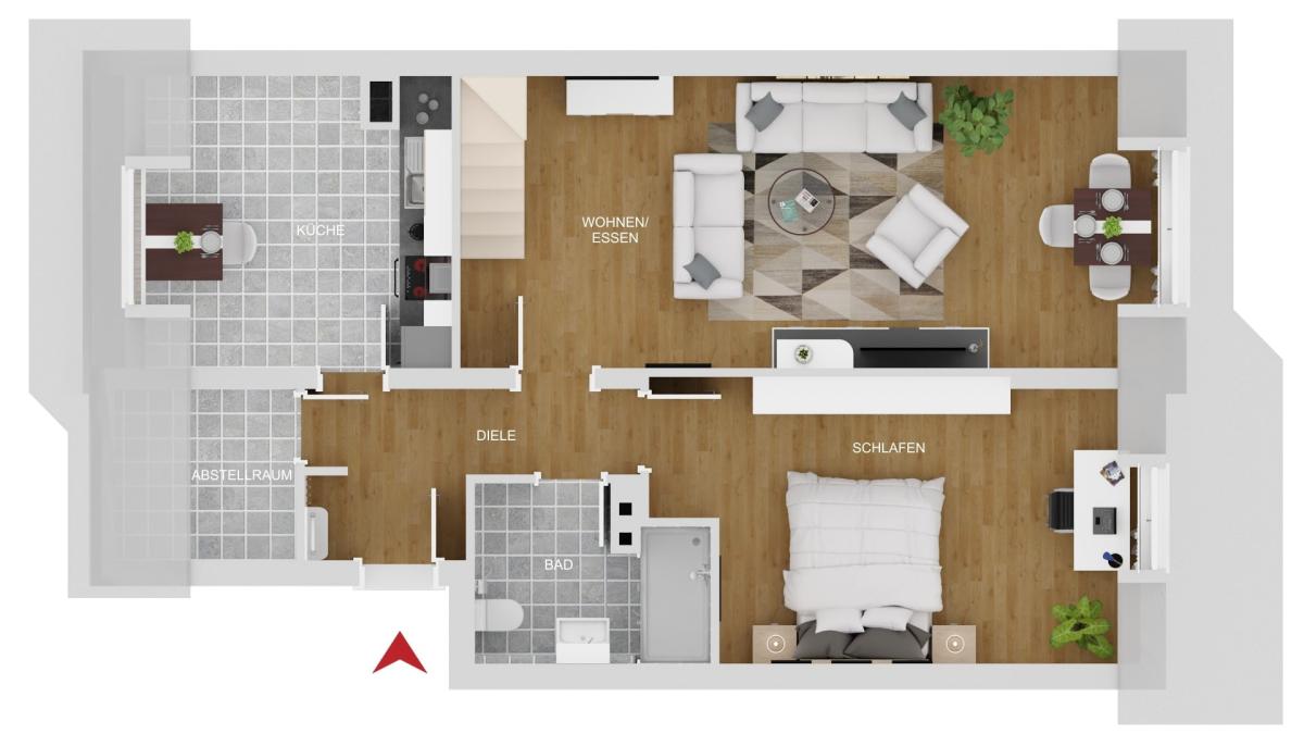 Sie erwartet ein großzügiger Wohn- und Essbereich, eine separate Küche mit ausreichend Platz, ein ruhiges Schlafzimmer sowie ein praktischer Abstellraum direkt neben der Küche.