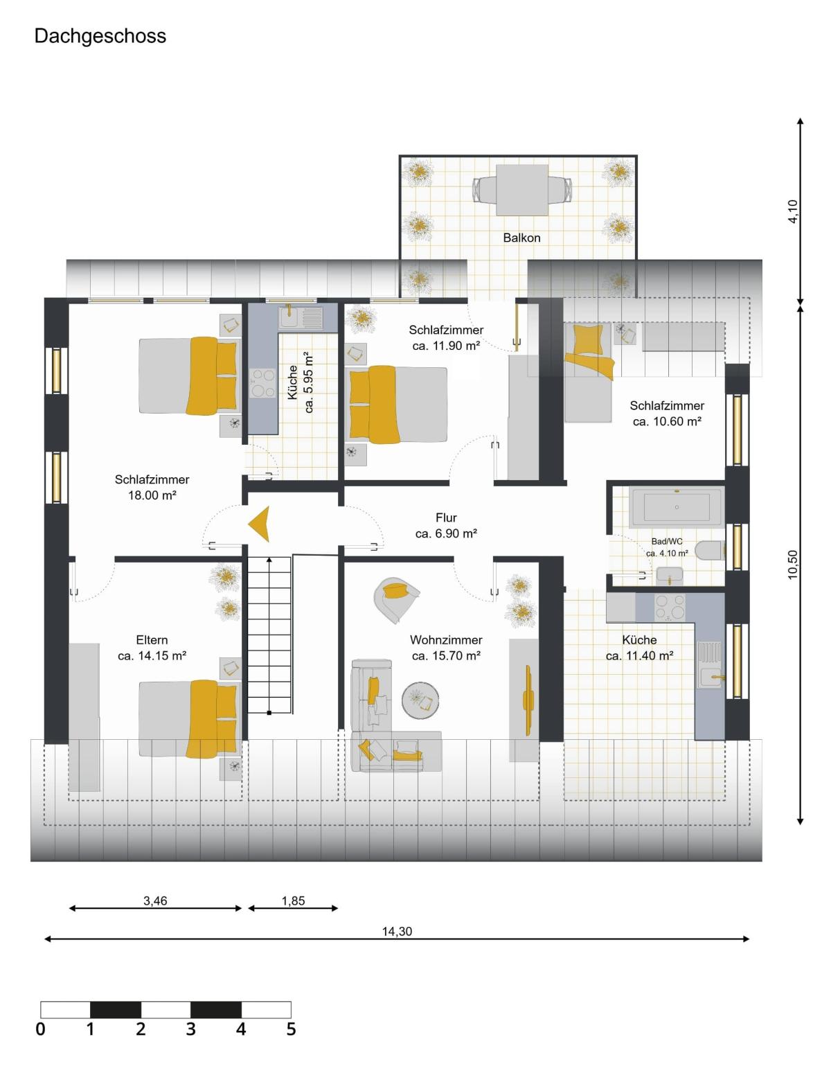 Das Dachgeschoss eröffnet weiteres Potenzial: Hier finden sich mehrere Schlafzimmer, die sich ideal für Kinder, Gäste oder zur individuellen Nutzung eignen. Ein Wohnzimmer, zwei Küchen und ein Duschbad runden die Etage ab. Besonders praktisch ist der Zugang vom Schlafzimmer auf den Balkon – ein kleiner, privater Freisitz im Obergeschoss. Durch die großzügige Wohnfläche und die bestehende Raumaufteilung bietet das Haus die Möglichkeit, zwei Wohneinheiten zu schaffen. So können Eltern, Kinder und Großeltern nah beieinander wohnen, ohne auf Privatsphäre verzichten zu müssen.