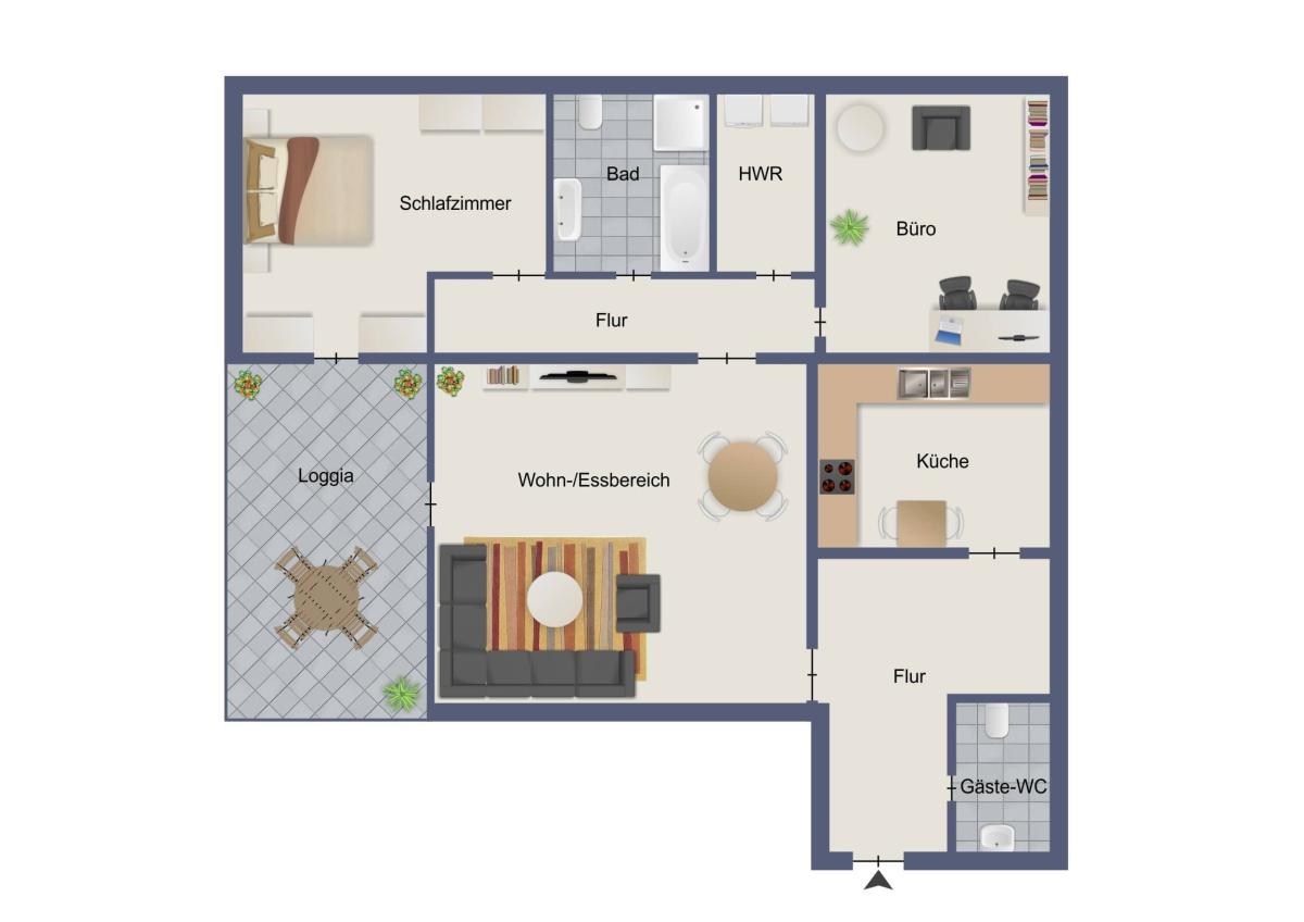Die Wohnung verfügt über ein großzügiges Schlafzimmer, ein gemütliches Wohnzimmer sowie ein Büro. Die praktische Einbauküche ist bereits vollständig ausgestattet und lädt zum Kochen und Genießen ein.