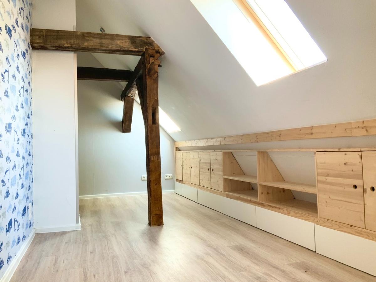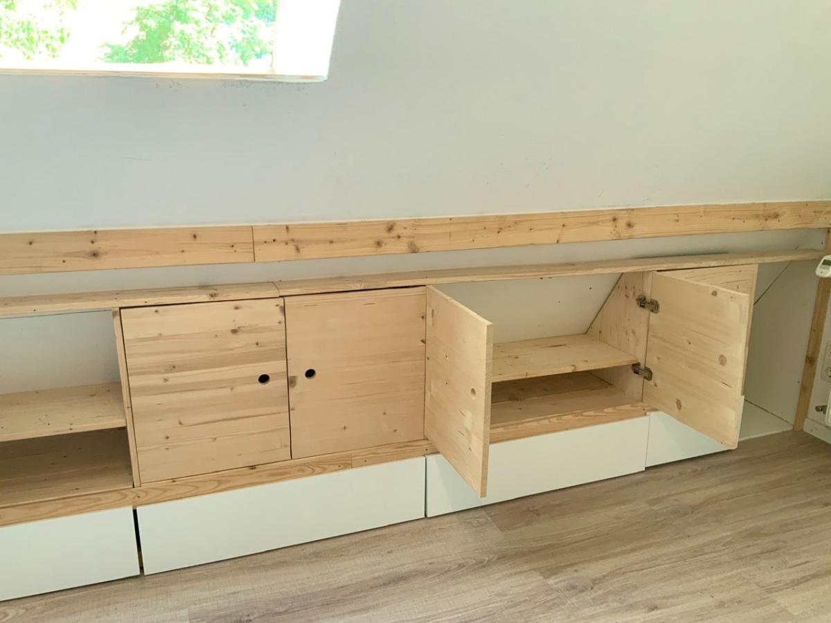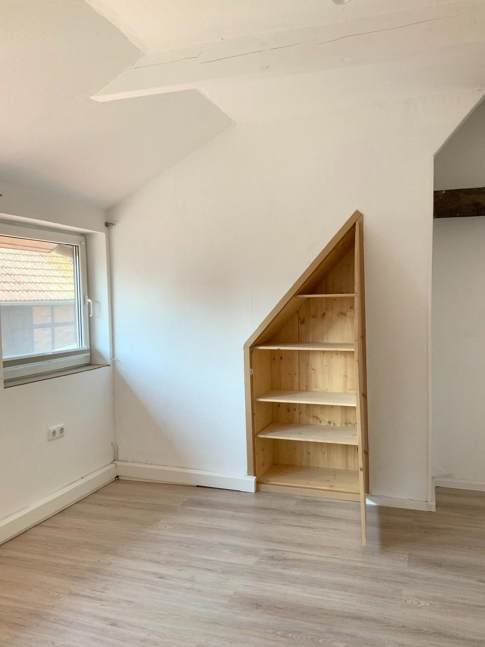Hier oben entstanden drei individuelle Zimmer und eine Abstellkammer. Der Flurbereich kann ebenfalls in den Schrägen als Stauraum genutzt werden. Das Dach wurde gedämmt und verfügt über Dachgauben. Im Spitzboden gibt es noch kleinere Lagerflächen.